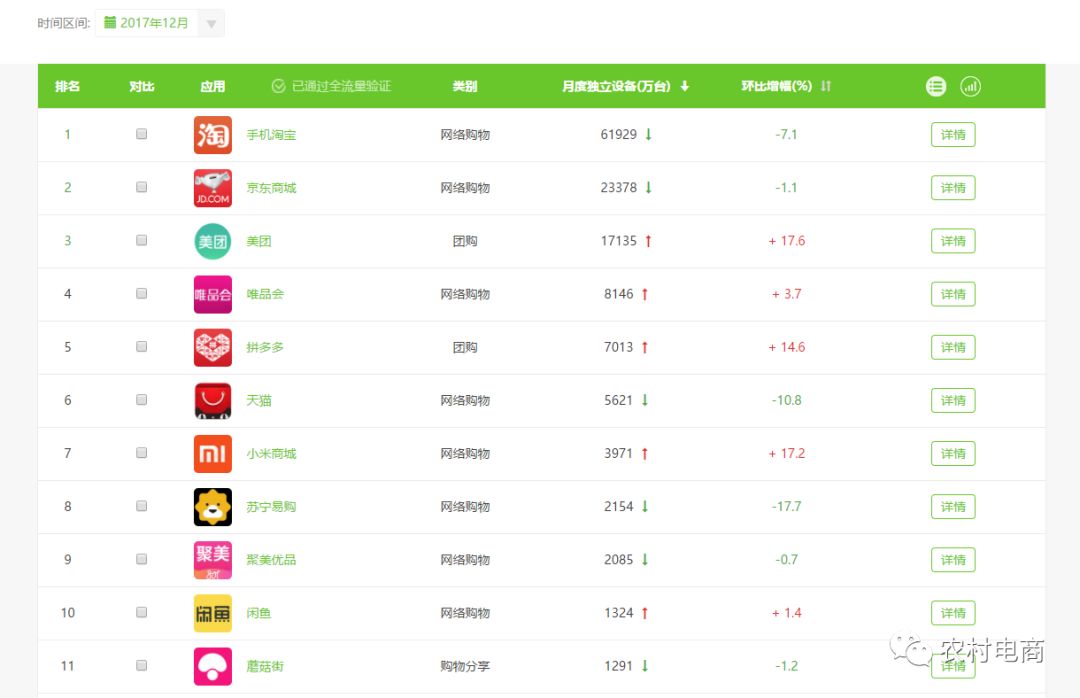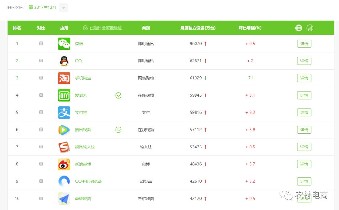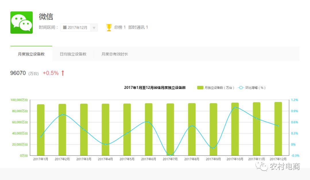 在移动互联网时代,流量的最大入口在社交,这已经是一个不争的事实,就电商而言,从近几年淘宝客的快速增长就明显看出,不管是阿里、京东、唯品会、蘑菇街、拼多多等大部分的流量都来自社交电商已成为不争的事实,那么移动互联网上的APP老大微信自然而然成为了各个电商平台及商家争夺流量的首要目标。从艾瑞数据显示,2017年12月独立APP设备量微信的数量接近10亿,看下图