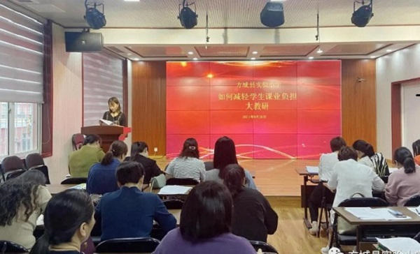 云天收夏色,木叶动秋声。为了响应国家“双减”政策,落实“五项管理”,实现学校教育教学可持续发展,深入学习贯彻方城县2021-2022学年教育工作会议精神,立足课堂教学,提高课堂效率。方城县实验小学于2021年9月26日上午举行“如何减轻学生课业负担”大教研活动。此次教研活动由教科室任艳主持,全体语文教师参加此次活动。