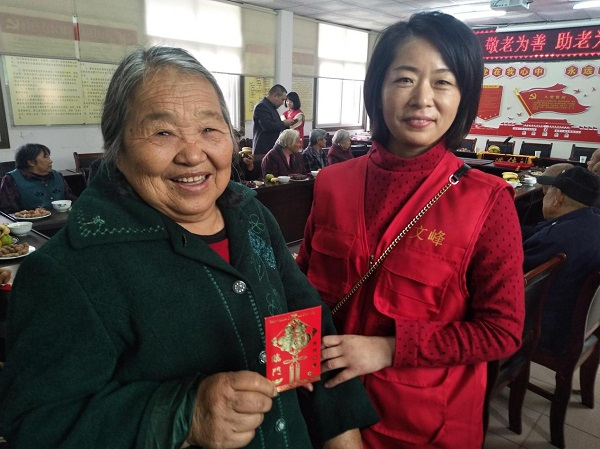 领到节日红包的大妈高兴得合不拢嘴