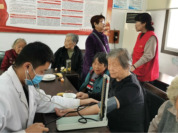 医务人员为老人们测血压